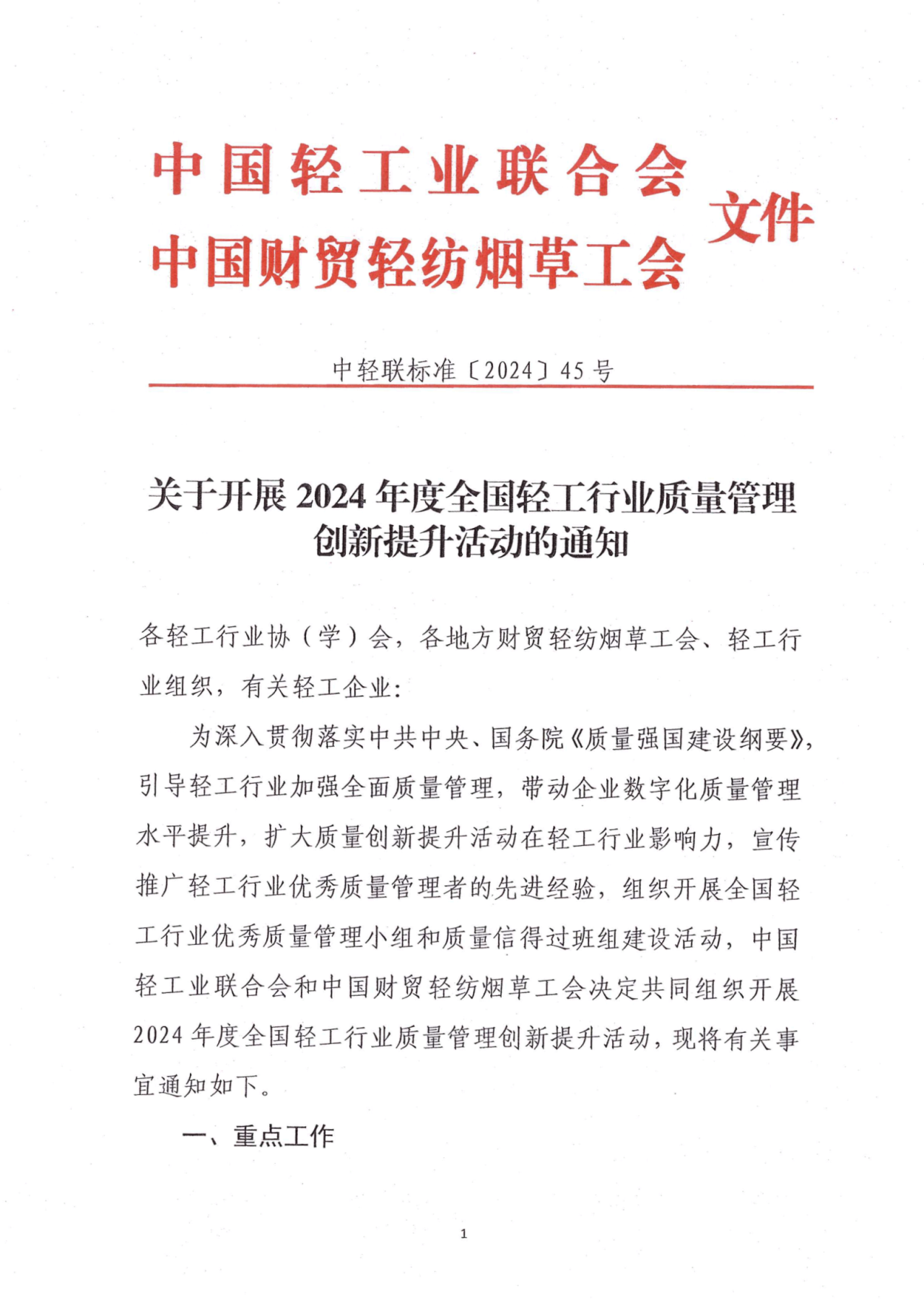 关于开展2024年度全国 质量管理创新提升活动的通知