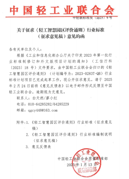 关于征求《轻工智慧园区评价通则》行业标准(征求意见稿)意见的函