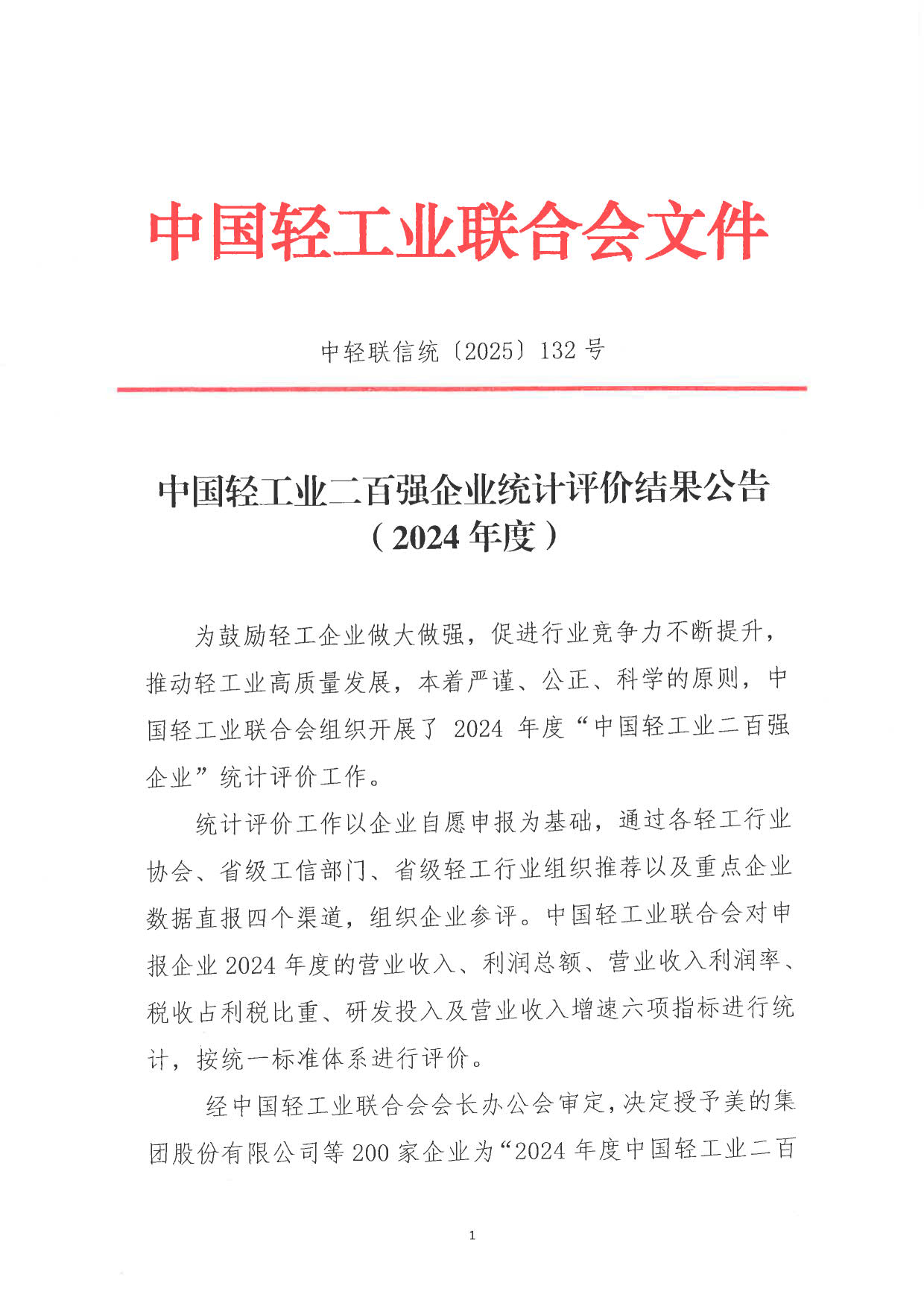 2024年度中国轻工业二百强企业评价结果公告