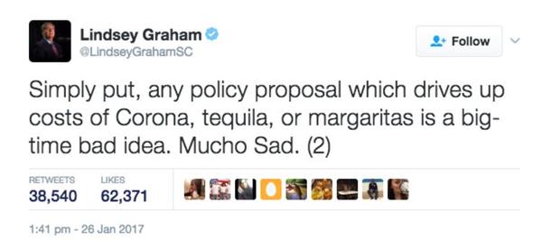 国会议员 Lindsey Graham 总结道,“简单地说,任何让 Corona、龙舌兰、玛格丽塔涨价的政策都是坏主意,让人伤心。”