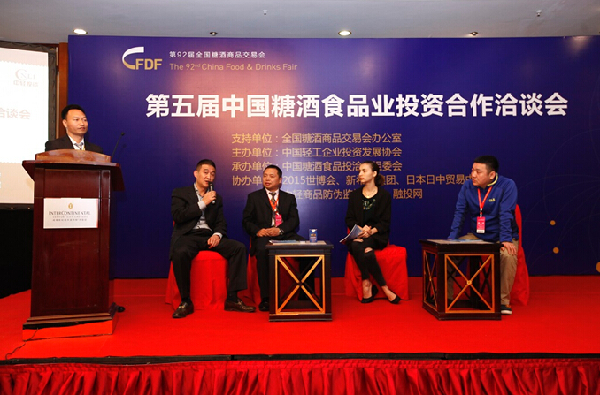 2015年3月25日下午13时,由中国轻工企业投资发展协会主办的第五届中国糖酒食品业投资合作洽谈会在第92届糖酒会上举办。本届投洽会以“大消费时代下的糖酒食品业”为主题,高规格高层次地讨论了行业的市场趋势、企业融资、O2O、食品防伪溯源、海外进出口贸易等热点话题。邀请了世博会组委会、日本日中贸易中心、中轻商品防伪监控中心、拉卡拉电商等平台机构,新希望集团、平安银行等近100家投资机构参会洽谈。全国糖酒会办公室主任古平到会致辞,他认为投洽会为酒类和食品企业与投资机构间搭建了桥梁,起到了非常重要的平台作用。本届投洽会引发了业界的高度关注,跨国企业、酒食业名企、国际运营商、相关专家及企业代表约300多人出席了会议。