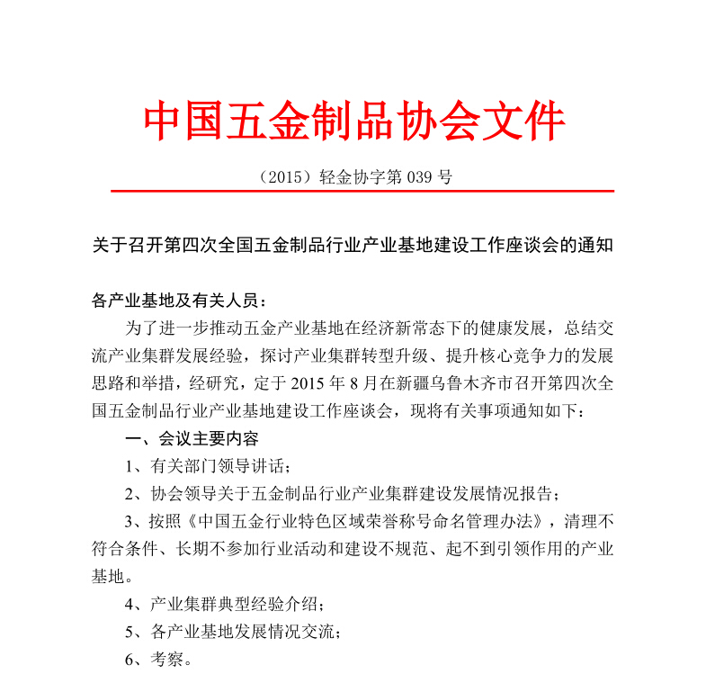 关于召开第四次全国五金制品行业产业基地建设工作座谈会的通知