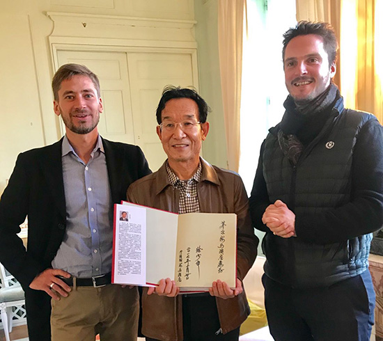 中国酒业协会文化委员会副秘书长、考察团团长王昕乐向哈杜橡木桶公司总裁Romain Liagre赠送协会纪念品