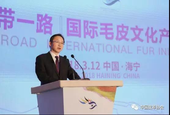 海宁中国皮革城董事长张月明代表中国业界在“一带一路”国际毛皮文化产业高峰论坛上作题为《世界毛皮产业的挑战和机遇》的主题演讲。