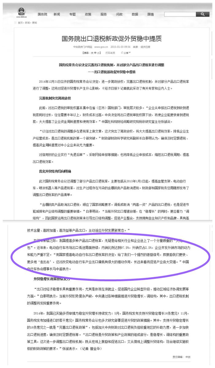 行业新年迎来“开门红”:自2015年1月1日起,电动自行车出口退税率将提高。这是从国务院总理李克强2014年12月31日主持召开的国务院常务会议上传递出来的消息。会议决定进一步简政放权,完善出口退税机制,并对部分产品出口退税率进行了调整,电动自行车位列其间。