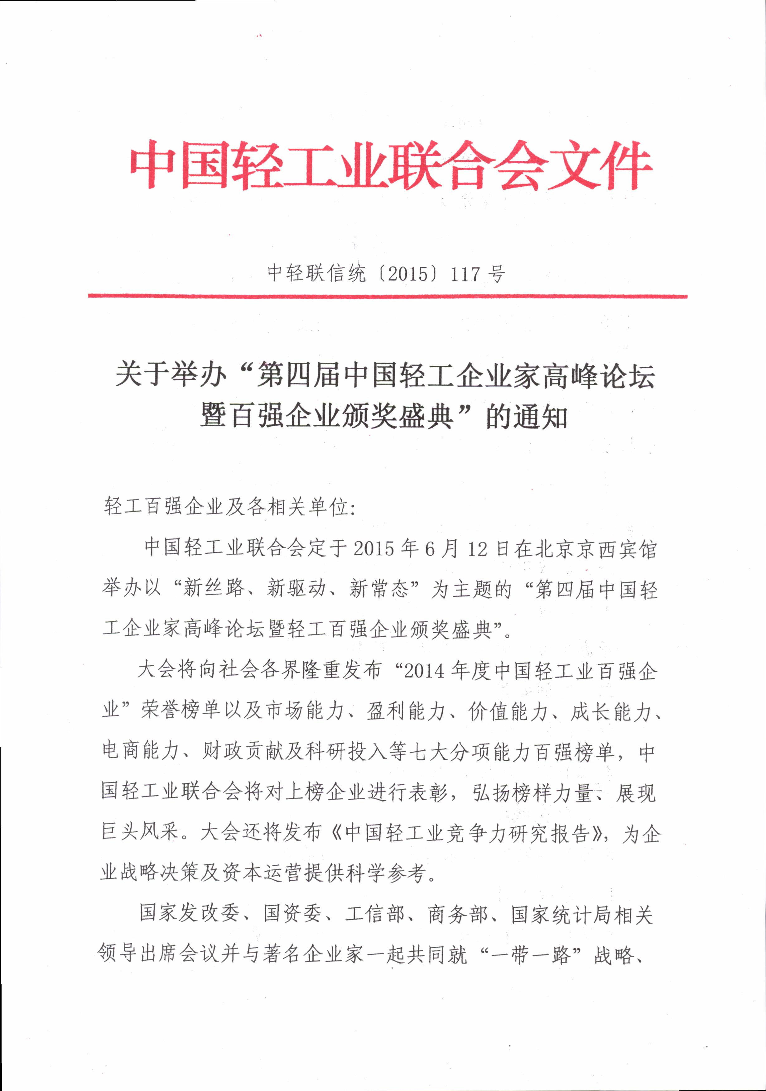 关于举办“第四届中国轻工企业家高峰论坛暨百强企业颁奖盛典”的通知