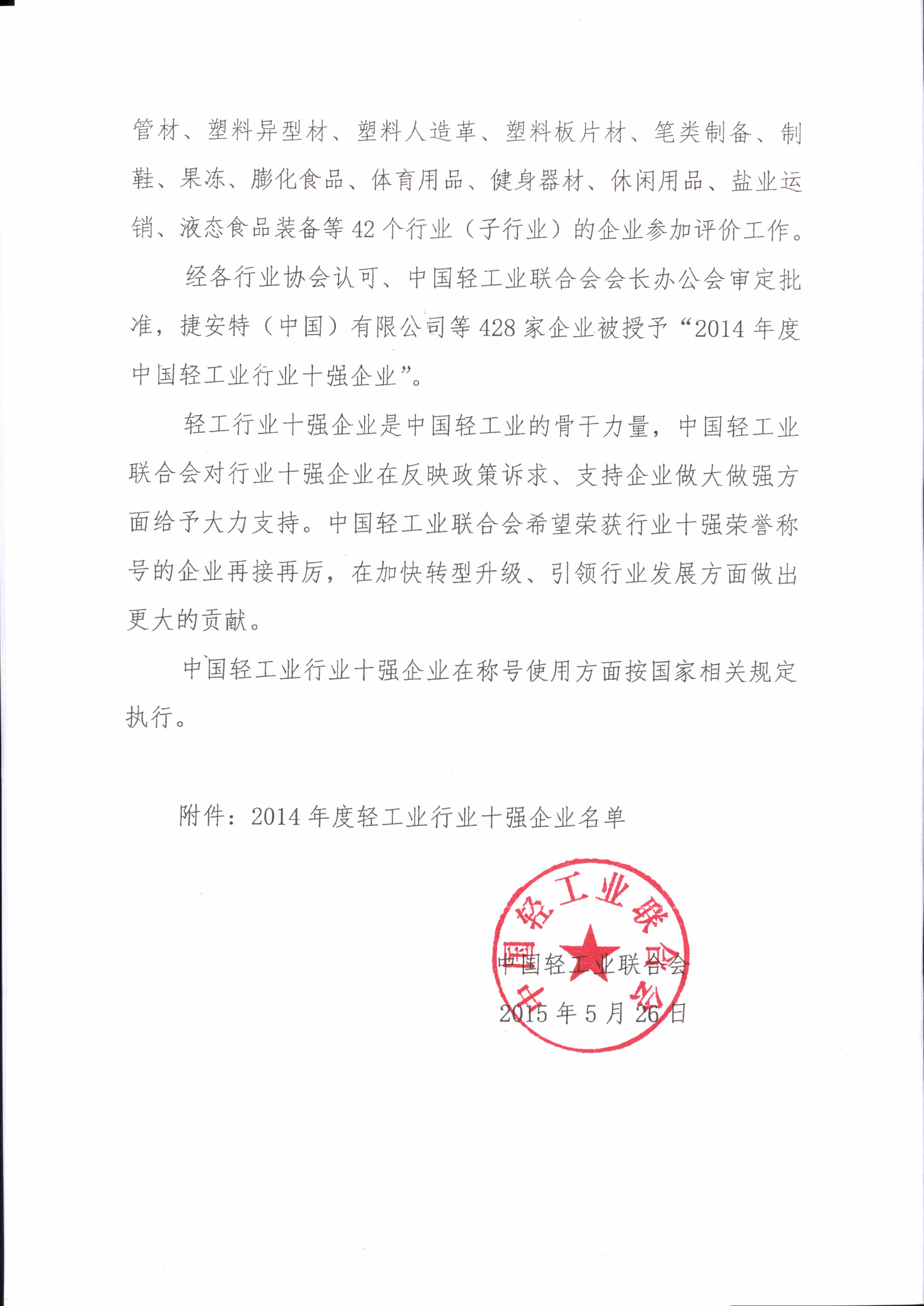 中国轻工业行业十强企业评价结果公告(2014年度)