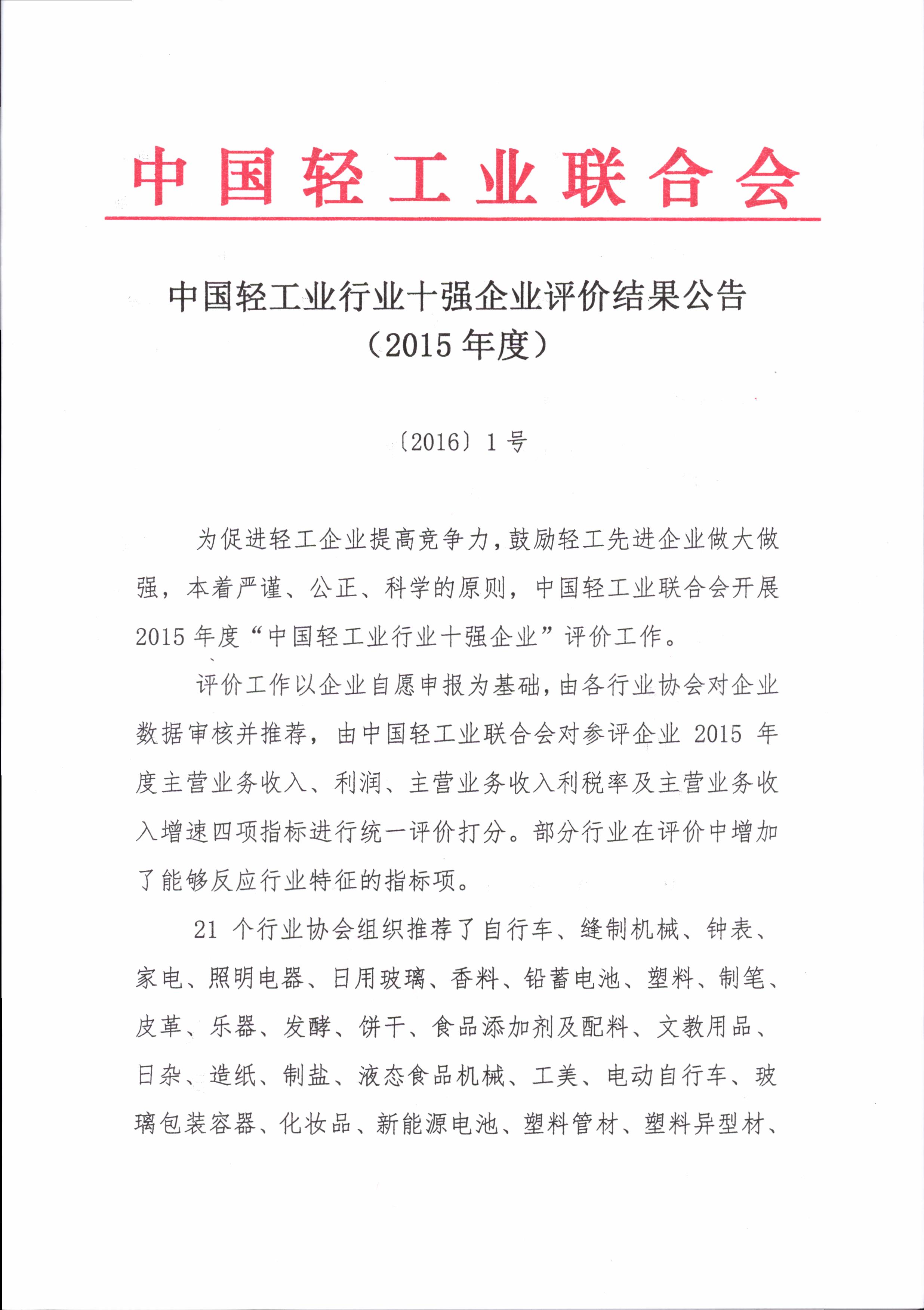 中国轻工业行业十强企业评价结果公告(2015年度)