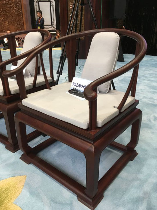 此次 G20峰会大圆桌和圈椅,由东阳市明堂红木制作。主会场家具设计灵感来自明清家具。直径21米的主会议桌为大果紫檀制,耗材上百吨缅甸花梨,上面的雕刻纹饰采用“西番莲纹”,由35个分部榫卯组合而成,借此传达不持偏见、不执定见、融会贯通、相辅相成的大国外交理念,展示中国传统文化的兼容和博大,也传达了世界各国经济合作过程中独立自主且合作共赢的精神。座椅采用最经典的“皇宫圈椅”造型,中国文化讲求寓意,圈椅上圆下方,有“天圆地方”之意;靠背有“国花牡丹”浮雕图案,寓意富贵吉祥,高尚圣洁。每个座椅还配备不同脚踏调节高度,不同尺寸靠垫调节坐深,保证舒适。