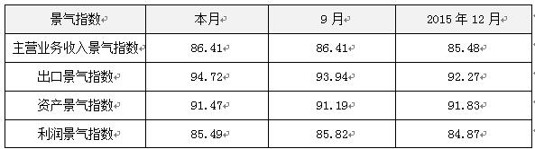 从分指标运行指数来看,今年以来主营、出口、利润三项分项景气指数均高于去年年末水平,资产景气指数略低于去年末期数。从前10月月度走势看,主营、资产景气指数保持平稳;出口景气指数呈“V”型波动走势,7月后开始回升;利润景气指数逐月下滑。10月当月,主营业务收入指数86.41,较上月持平;出口景气指数94.72,环比上升0.78点。资产景气指数91.19,环比上升0.28点。利润景气指数85.49,较上月下降0.33点。