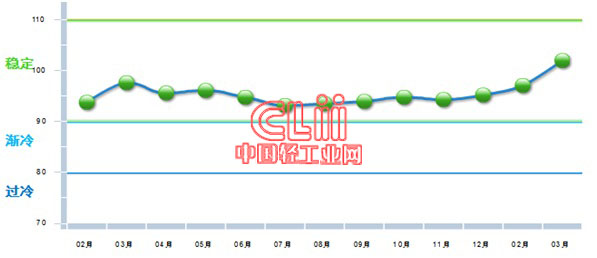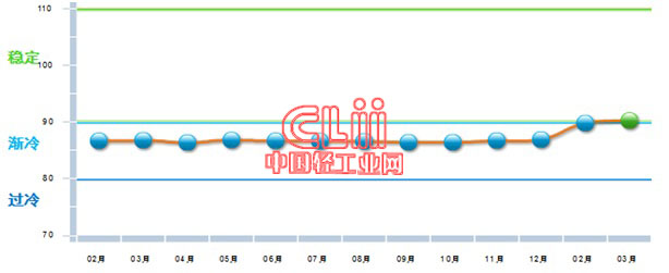 中国轻工业经济运行及预测预警系统数据显示:2017年3月份中轻景气指数为91.08,较上月提高0.69点,该指数自今年年初重回绿色“稳定”区间,说明本年开年,轻工业经济运行有企稳回暖态势。