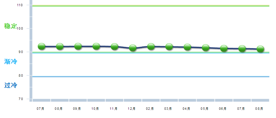 中国轻工业经济运行及预测预警系统数据显示:2018年开年,中轻景气指数延续去年四季度以来的下降态势,连续8个月在蓝色“趋冷”区间波动,6月以后呈现稳中缓升态势。8月中轻景气指数为88.39,环比7月上升0.15点,较去年同期下降1.99点。