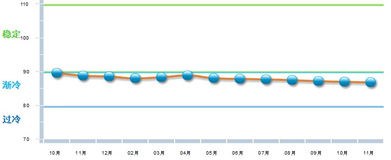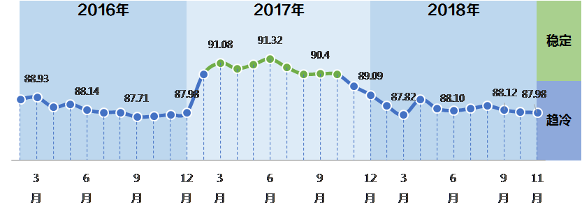 中国轻工业经济运行及预测预警系统数据显示:2018年,中轻景气指数延续去年四季度以来的下降态势,连续11个月在蓝色“趋冷”区间波动,11月中轻景气指数为87.98,环比10月下降0.03点,较去年同期下降1.64点。