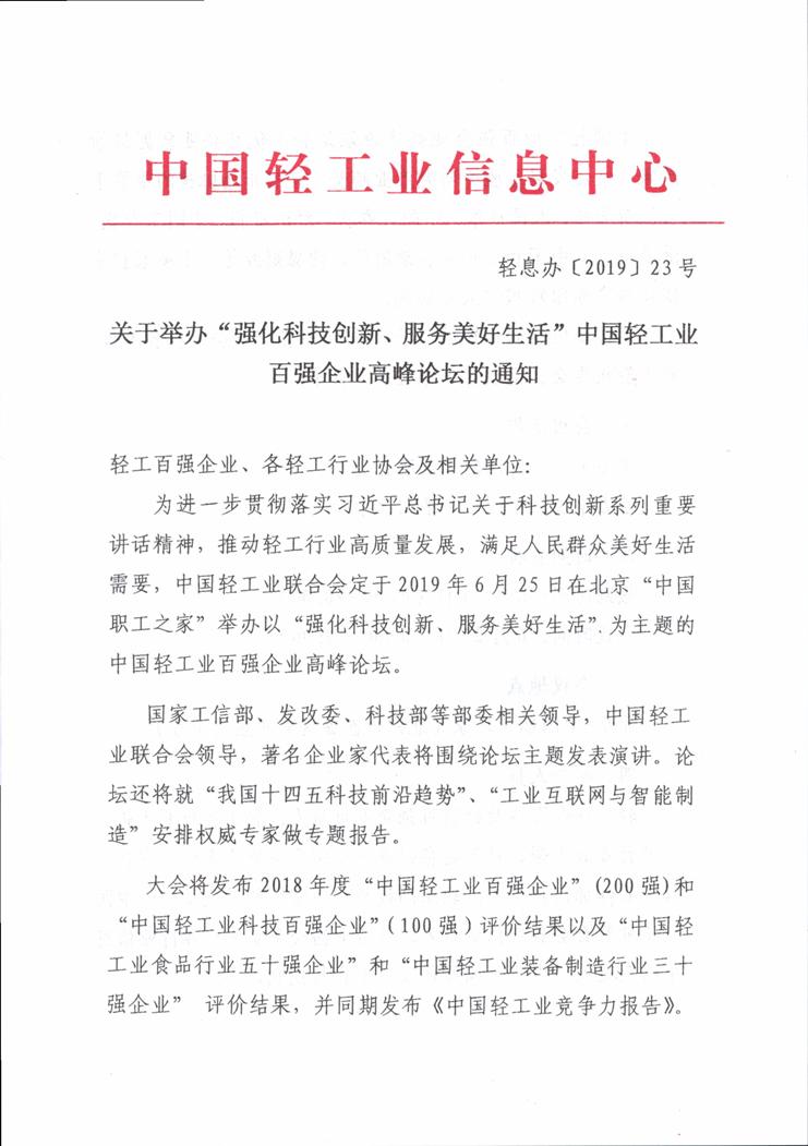 关于举办“强化科技创新、服务美好生活”中国轻工业百强企业高峰论坛的通知