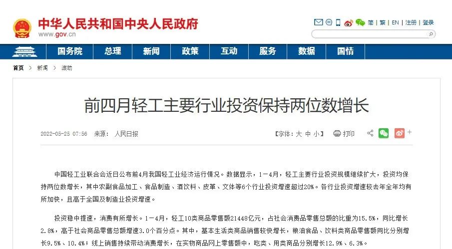 5月25日,人民日报报道了对张崇和会长的采访,文章以“前四月——轻工主要行业投资保持两位数增长”为标题深入报道当前国内轻工业经济运行情况,张崇和会长表示,今年以来轻工业承压前行,但长期向好发展的趋势不会改变,当前各项政策靠前发力,政策效应逐步释放。随着疫情管控取得成效,经济秩序快速恢复,我们对轻工业良好的发展前景充满信心。中国政府网等权威媒体也同步宣传报道。