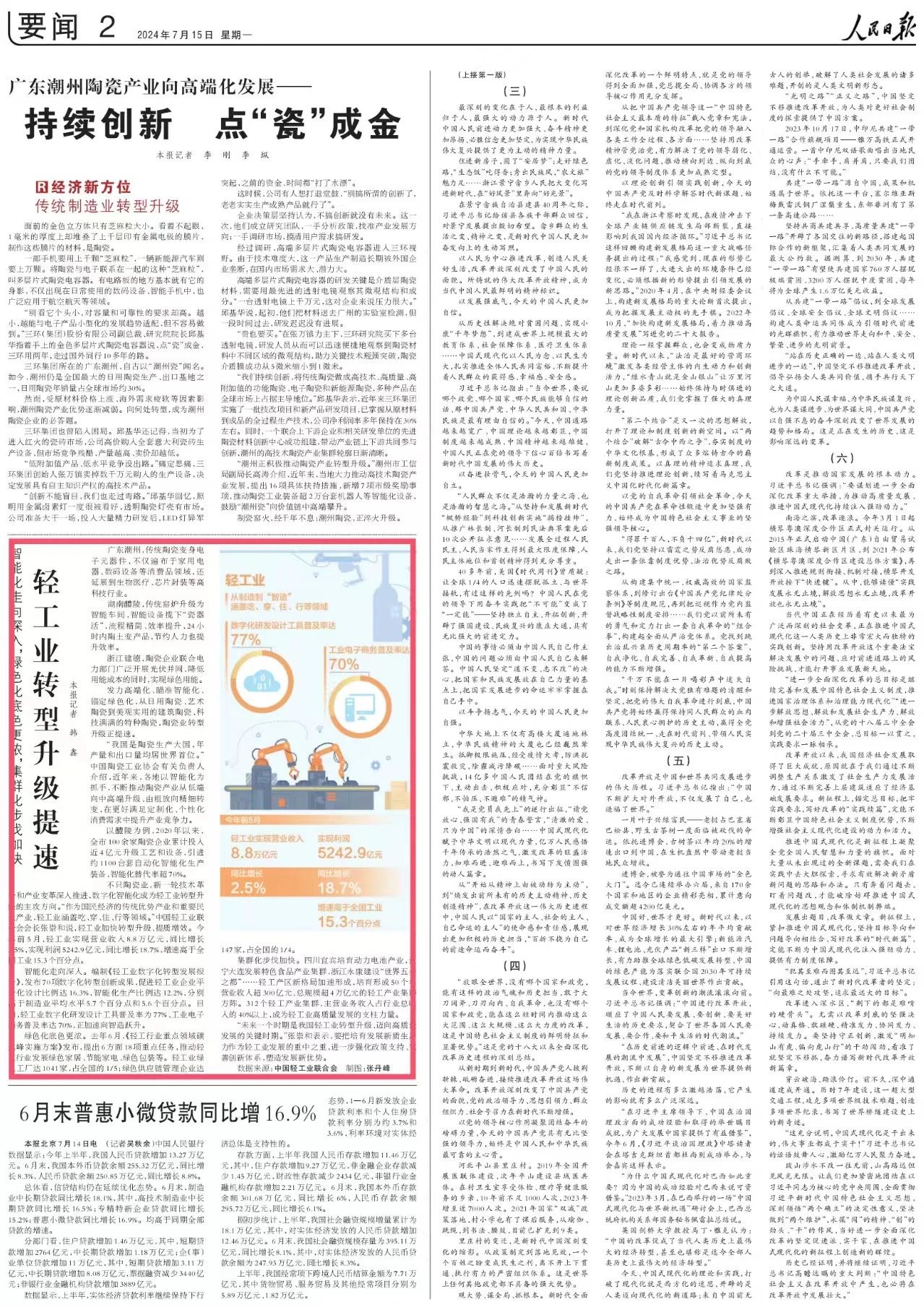 7月15日,人民日报要闻版报道轻工业转型升级良好态势,报道指出轻工业智能化走向深入、绿色化底色更浓、集群化步伐加快。 张崇和会长指出,“未来一个时期是我国轻工业转型升级、迈向高质量发展的关键时期。要把培育发展新质生产力作为轻工业发展的重中之重,进一步强化政策支持、完善创新体系,塑造发展新优势。”(全文如下)