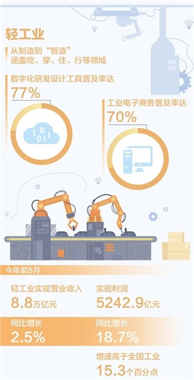 不只陶瓷业,新一轮技术革命和产业变革深入推进,数字化智能化成为轻工业转型升级的主攻方向。“作为国民经济的传统优势产业和重要民生产业,轻工业涵盖吃、穿、住、行等领域。” 会长张崇和说,轻工业加快转型升级、提质增效。今年前5月,轻工业实现营业收入8.8万亿元,同比增长2.5%,实现利润5242.9亿元,同比增长18.7%,增速高于全国工业15.3个百分点。