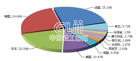 化妆品主要进口来源地有:法国、韩国、日本、美国等国家,其中由法国进口占进口比重的25.16%(见图1)。
