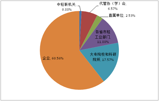中轻联机关7人,占会员总数的0.88%;代管协(学)会52家,占会员总数的6.57%;直属单位20家,占会员总数的2.53%;各省市轻工业部门94家,占会员总数的11.88%;大专院校和科研院所139家,占会员总数的17.57%;企业479家占会员总数的60.56%。