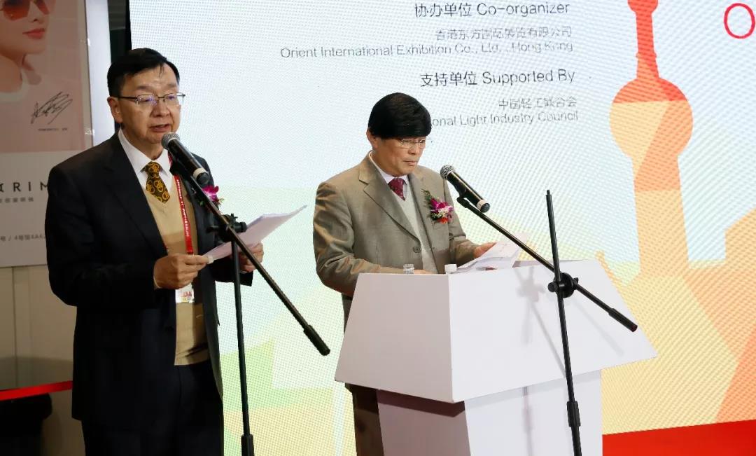 中国眼镜协会秘书长戴维平(右)主持开幕式,香港东方国际展览有限公司总经理钟建侨(左)担任翻译