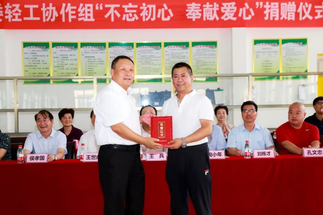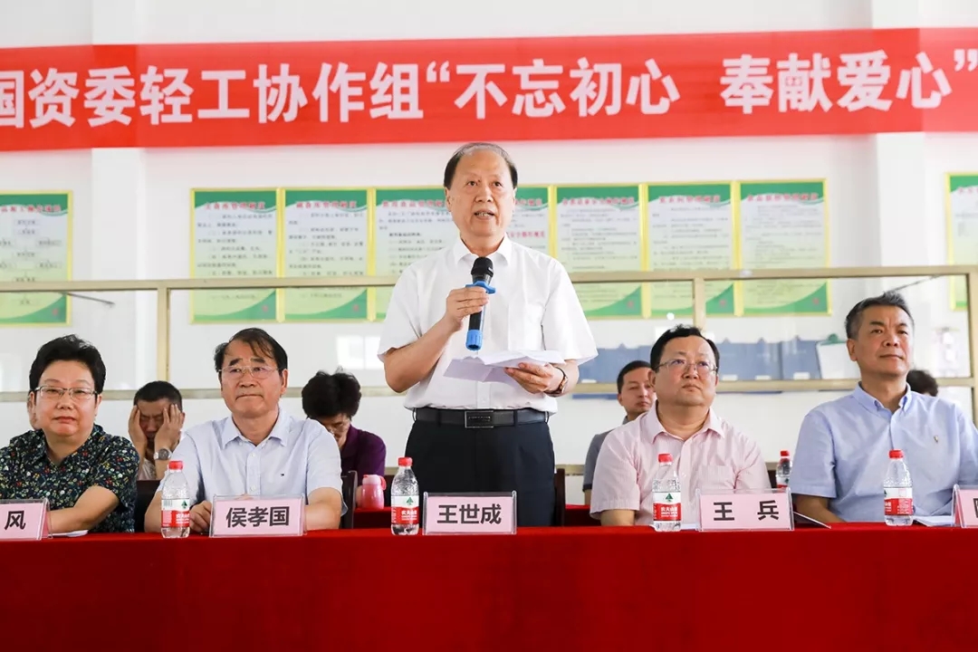 王世成首先代表 会长、党委书记张崇和和国资委轻工协作组,向辛勤耕耘在教育一线的老师们表示崇高的敬意,向同学们和老乡们表示诚挚的问候。同时也向大力支持本次捐赠活动的中国家用电器协会、中国乐器协会、江苏东方乐器有限公司和积极参与平乡县产业扶贫的中国自行车协会、中国生物发酵产业协会和中轻联认证中心表示感谢。