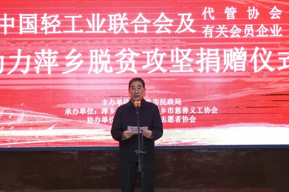 11月14日上午, 助力萍乡脱贫攻坚捐赠仪式在萍乡宏基大酒店举行。 秘书长杜同和,萍乡市委副书记陈云,市委常委、副市长廖鸿以及中轻联部分代管协会负责人参加了捐赠仪式。