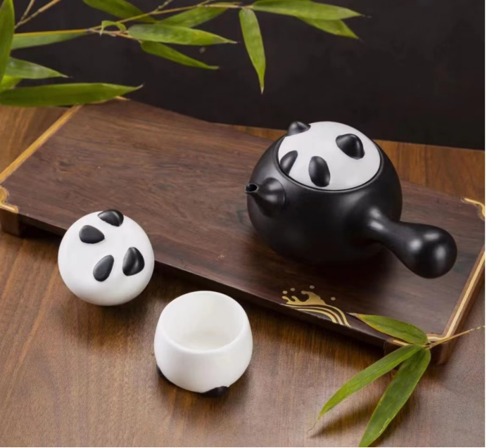 高淳陶瓷以冰墩墩的原型熊猫为设计灵感,将国宝与茶道巧妙结合,打造了小熊猫——盛林骨瓷茶具。