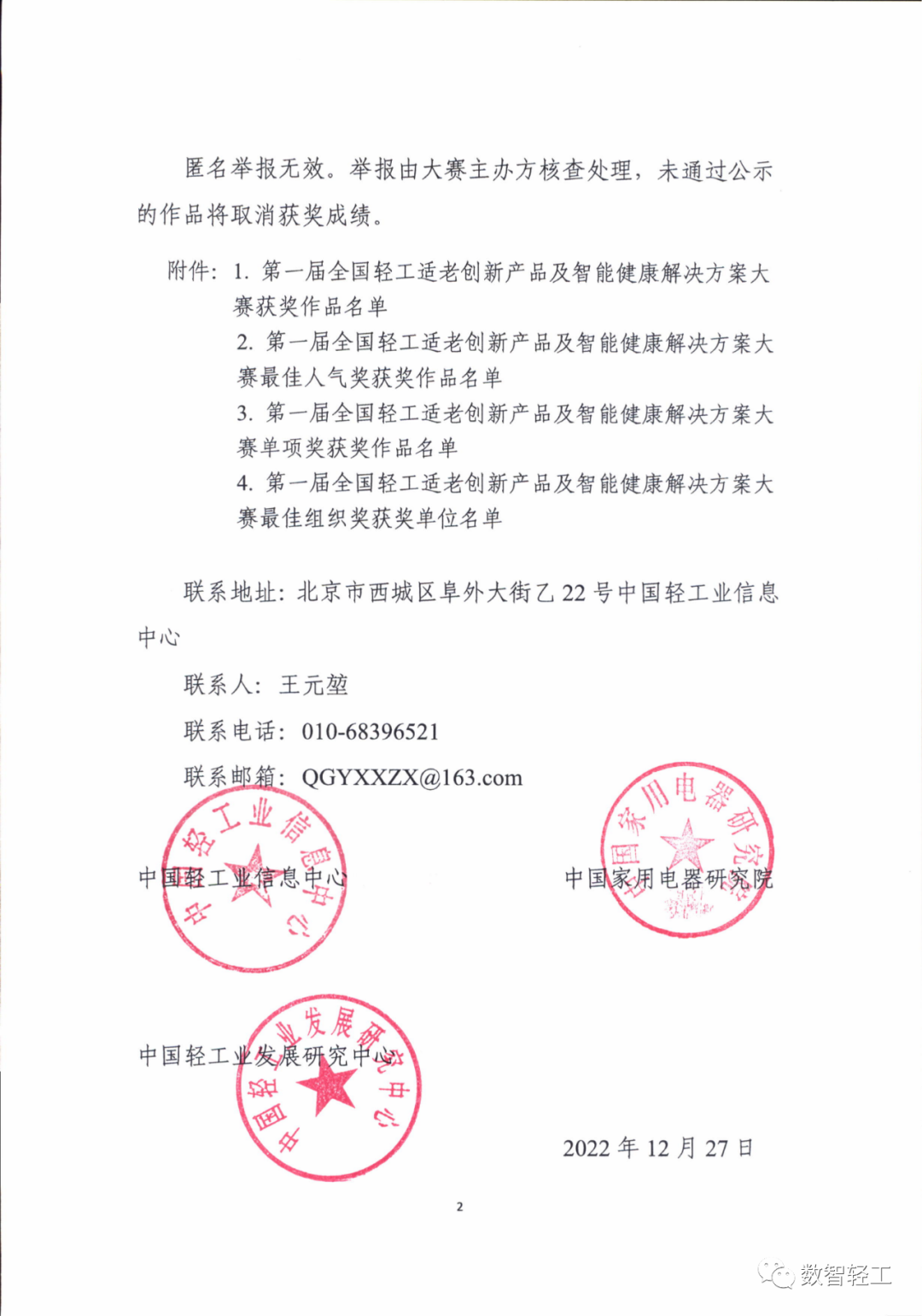 在工信部的大力支持下,由 指导, 、中国轻工业发展研究中心、中国家用电器研究院联合主办的第一届全国轻工适老创新产品及智能健康解决方案大赛,得到了政府、部委以及各行业的鼎力支持,以及各轻工企业的积极响应。大赛经过作品征集、初赛、复赛、决赛四个环节,通过网上投票、专家评委评分,最终产生六个组别的奖项及最佳人气奖等单项奖。获奖作品公示如下: