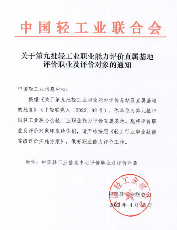 为深入贯彻落实习近平总书记关于技能人才培养的重要指示精神,根据《关于第九批轻工业职业能力评价总站及直属基地的批复》(中轻联党人〔2023〕92号),2023年4月18日,