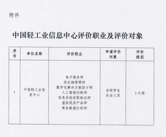 被批准成为轻工业首家数字职业能力评价直属基地。主要针对数字经济职业开展评价颁证,评价对象和级别主要包括: