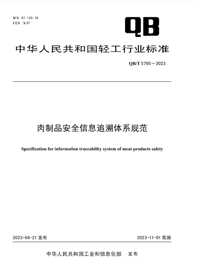 2023年5月22日,中华人民共和国工业和信息化部发布公告(2023年第7号),正式发布《肉制品安全信息追溯体系规范》(QB/T 5795-2023)行业标准。标准实施日期为2023年11月1日。该标准适用于我国预包装肉制品安全信息追溯体系的设计、建设、运行与管理。