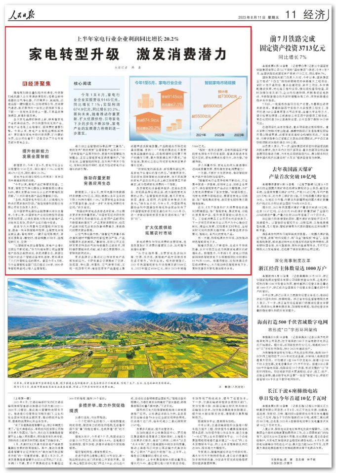 本期报道以《上半年家电行业企业利润同比增长20.2%——家电转型升级 激发消费潜力》为题,详情如下。
