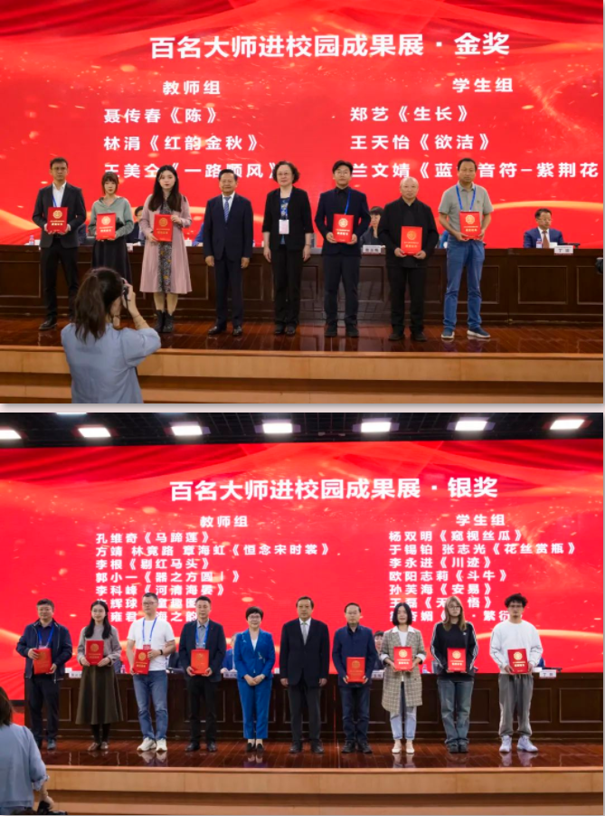 为集中展示大师进校园优秀成果,“百名大师进校园成果展”在大会同期举办,集中展示大师与院校传承创新优秀成果。共展出286件师生作品,涵盖陶瓷、金属、雕塑、漆器等九个工艺美术品类,充分体现了大师与师生的技艺水平和勇于创新的精神,呈现出院校工艺美术传承创新的新鲜活力。大会为评选出金奖金奖6个,银奖14个,铜奖16个,优秀奖24个,并为获奖选手颁奖。