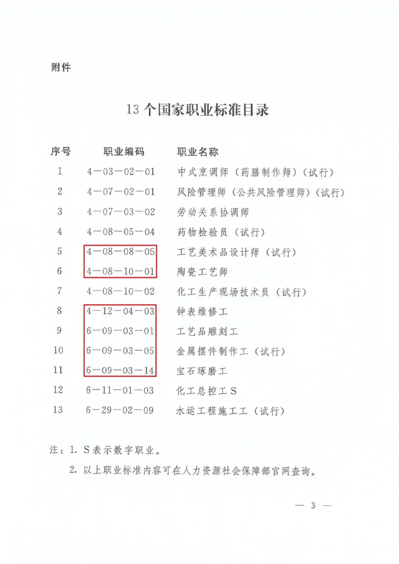 日前,人社部办公厅印发《关于颁布中式烹调师(药膳制作师)等13个国家职业标准的通知》(人社厅发[2025]8号)。由 牵头承担的《工艺美术品设计师》、《陶瓷工艺师》、《钟表维修工》、《工艺品雕刻工》、《金属摆件制作工》、《宝石琢磨工》6项职业标准获准颁布。
