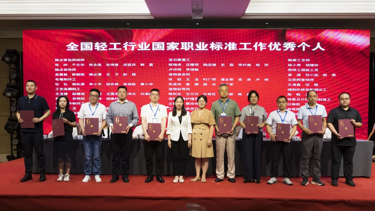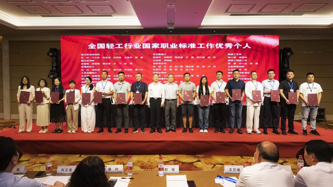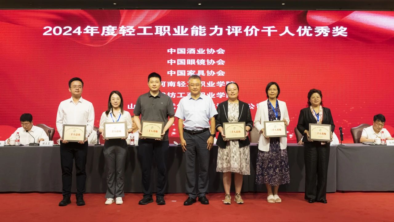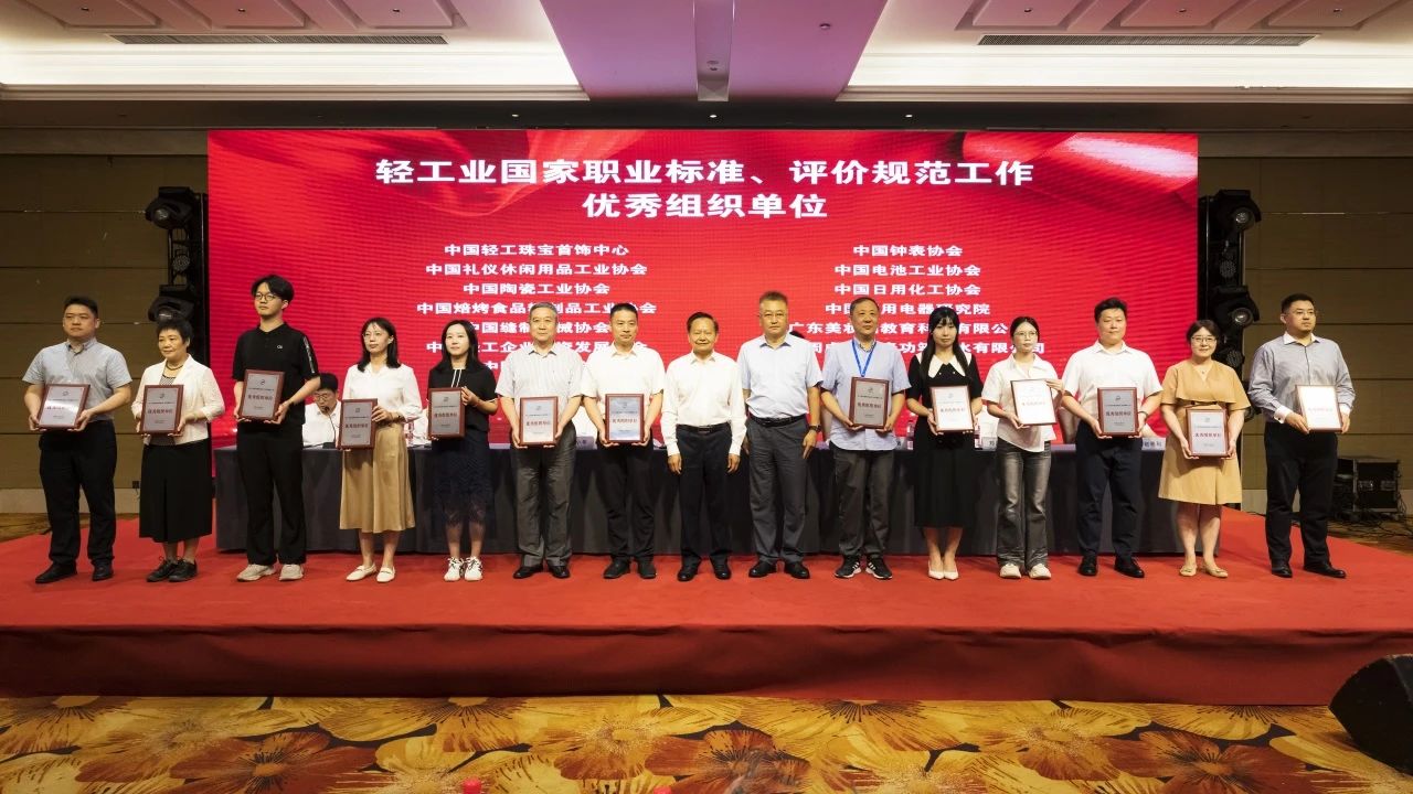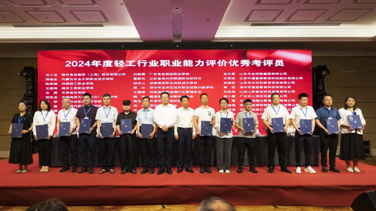 大会授予中国焙烤食品糖制品工业协会等6家单位“2024年度轻工职业能力评价千人卓越单位”称号;授予中国酒业协会等6家单位“2024年度轻工职业能力评价千人优秀单位”称号;授予中国乐器协会等15家单位“2024年度轻工职业能力评价千人奋进单位”称号;授予义乌市工艺美术行业协会等3家单位“2024年度轻工职业能力评价特色培训基地”称号;授予俞嘉毅等30人“2024年度 职业能力评价先进个人”称号;授予戎小龙等30人“2024年度 职业能力评价优秀考评员”称号;授予干文华等30人“2024年度 职业能力评价优秀督导员”称号;授予中国轻工珠宝首饰中心等13家单位“轻工业职业标准、评价规范工作优秀组织单位”称号;授予张帅等82人“全国 国家职业标准工作优秀个人”称号;授予徐力等26人“全国 评价规范工作优秀个人”称号。