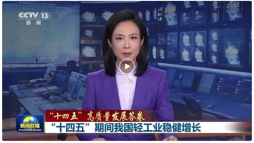 10月15日,央视《新闻联播》【“十四五”高质量发展答卷】援引 权威信息,报道轻工业“十四五”发展成就。报道指出,“十四五”期间,我国轻工经济总量持续增长,市场优势不断巩固,品牌竞争力大幅提升,产业发展坚实有力。(全文如下)