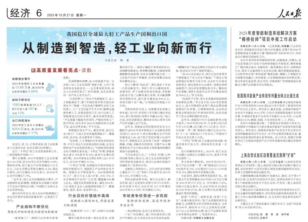 10月27日,《人民日报》援引 权威信息,报道轻工“十四五”发展成就。张崇和会长在接受采访时总结指出:“近年来,轻工业经济规模稳步攀升、产业链韧性显著增强,我国成为全球最大的轻工产品生产国和出口国。”(全文如下)