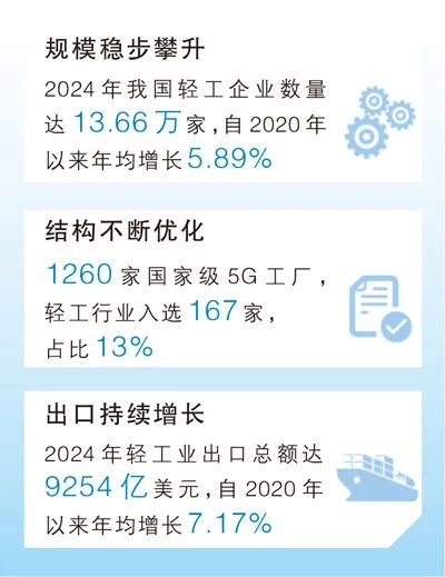 近日,“十四五”轻工业发展成绩单公布,三组数据格外亮眼——看行业规模,2024年我国轻工企业数量达13.66万家,自2020年以来年均增长5.89%;看市场表现,轻工重点产品零售额达7.93万亿元,占社会消费品零售总额的16.2%;看出口情况,出口总额达9254亿美元,自2020年以来年均增长7.17%。
