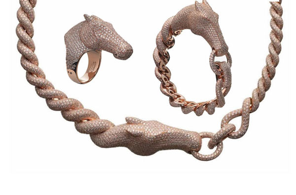 爱马仕Herms推出2014马年主题系列首饰,包括以马头为造型的项链、手镯与戒指。这条首饰以玫瑰金色为底色,碎钻镶嵌的工艺看上去非常大气磅礴,夸张的设计令人过目难忘。