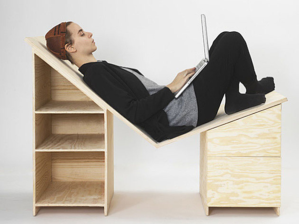 说到书桌,浮现于眼前的往往是可以放电脑、资料等的平坦表面,可能还有一张对应的凳子,不过设计团队 Minna Magnusson 可不这么想。这款有着折角表面的书桌就是他们的新作,尽管也有普通书桌用来收纳物品的柜子、抽屉等设计,但这款书桌更想强调一种介于工作与放松之间的状态,让使用者躺上桌子来办公。一个不按常理出牌的设计作品,尽管因此带来的办公效率可能因人而异,但这样的尝试本身就是非常令人惊喜的。