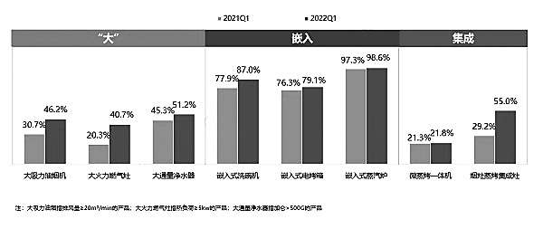 在疫情反复的背景下,原本应该迎来销售旺季的厨卫电器在一季度的表现不及预期,整体销售规模同比下降9.7%,但集成灶、洗碗机等新兴品类仍处在上升通道,市场规模分别同比增长31.5%、17.7%。