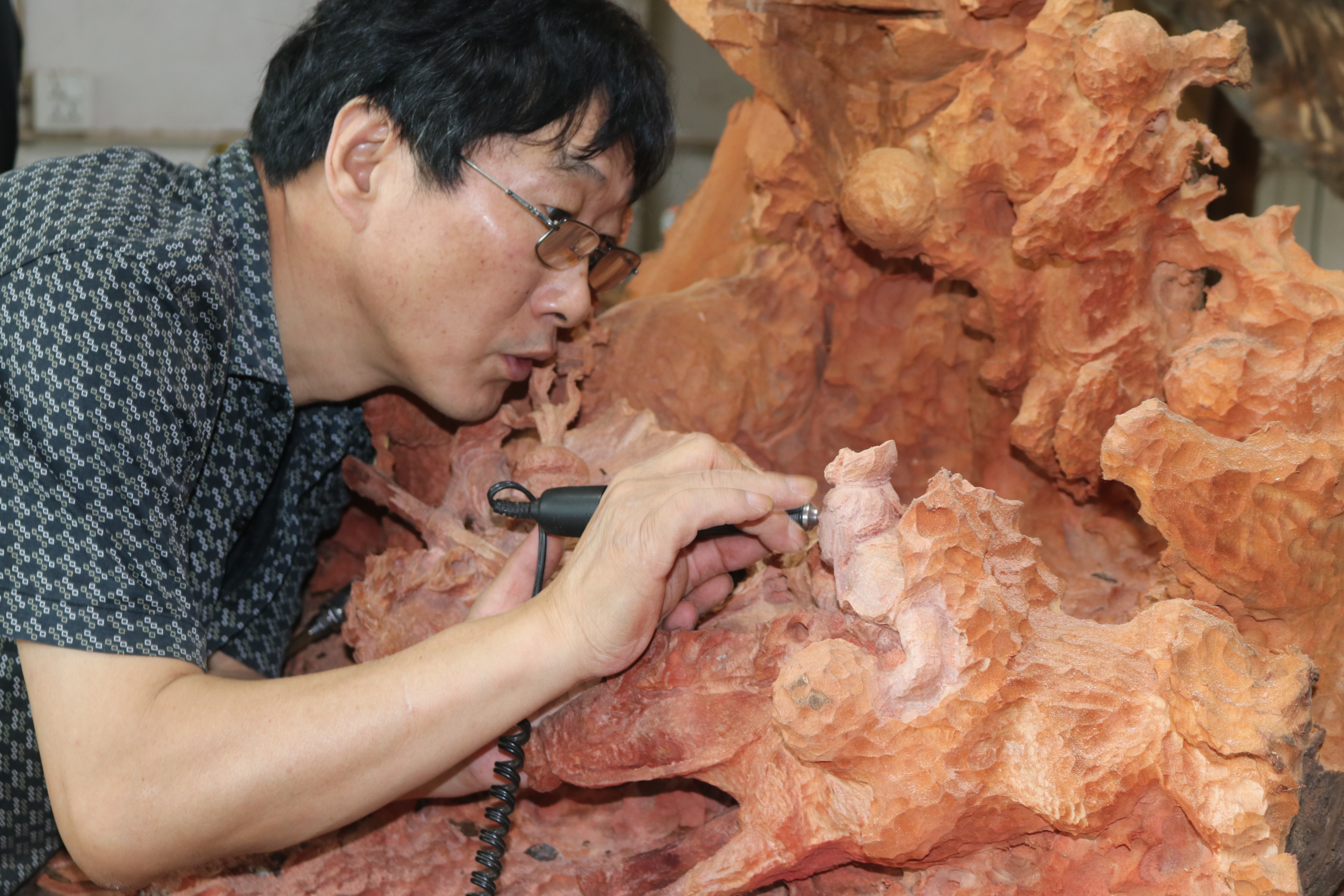 传统圆雕发展到“根雕”特别是对大型木雕作品具有极强的设计掌控能力,他创作的木雕作品,结构合理,层次分明,运用浮雕、镂雕、透雕技法极其娴熟,使得其作品具有很高的艺术欣赏性。