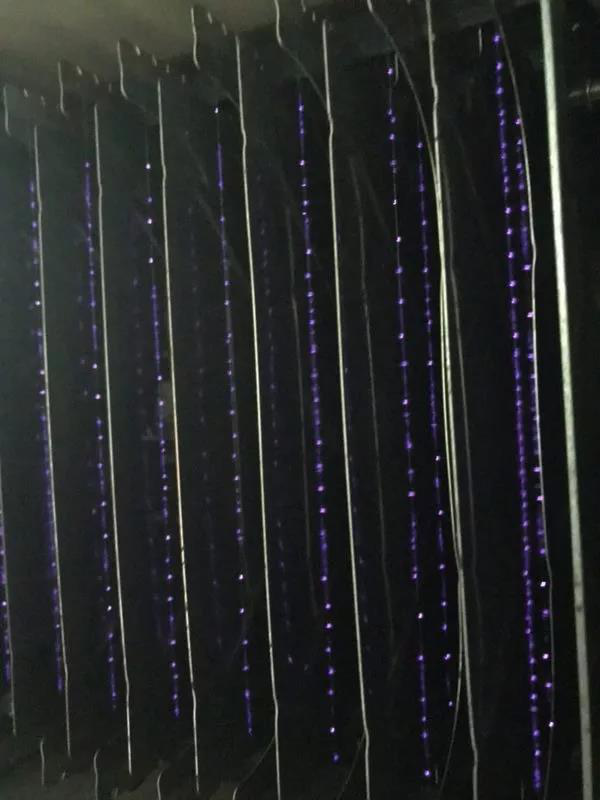 在黑暗的房间里,电磁场在电极板和电极丝四周呈现出紫色的“小火花”,看起来就像极光一样,非常漂亮。这也是胡承杰工作室老拉着窗帘的原因了。