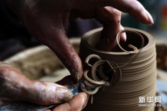 1月8日,在重庆市黔江区濯水镇三门社区,村民刘沛良修整茶壶陶坯。