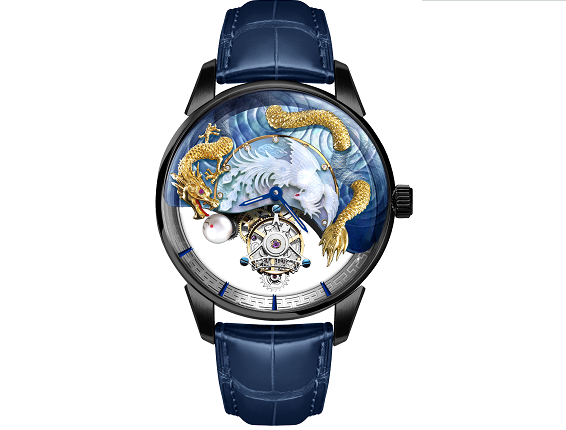 表面以天地为背景,参考中国明代末、清代初的宫廷雕刻打造的18K金立体金龙栩栩如生,从水底探出头;于中心盘旋的“火凤”以精湛的浮雕技术,勾勒出祥和神色,镶嵌于离表面半毫米的位置,呈现在空中飞翔的景象。腕表8时位置,以极精密的技术把日本阿古屋珍珠掏空,加入数条目前世界最强光的高科技氚气管,于直径只有5毫米的空间放入足足9件零件,令“内丹”在漆黑中散发光芒,再现了“龙吐珠”的传说!“内丹”以每60秒转一圈的速度转动,与置于6时位置的飞行陀飞轮相辉映。陀飞轮每小时振频达28800次,更配合72小时动力储存。内丹如轮转动,周而复始,寓意福寿无疆。