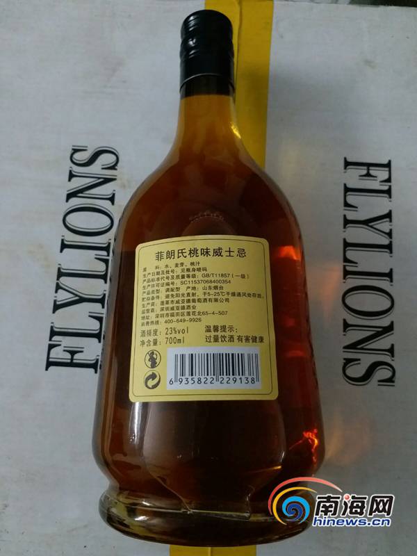 海南省食药监局稽查局、文昌市食药监局执法人员在文昌迈阿密酒吧查获553瓶涉案厂家生产的“菲朗氏桃味威士忌”。图为“菲朗氏桃味威士忌”。海南省食药监局稽查局供图