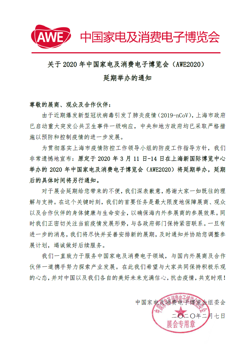 为了贯彻落实疫情防控工作指导方针,2月8日,中国家电及消费电子博览会组委会发布通知,宣布原定于2020年3月11日-14日于上海新国际博览中心举办的2020年中国家电及消费电子博览会(简称“AWE2020”)将延期举办,延期后的具体时间将另行通知。通知内容具体如下: