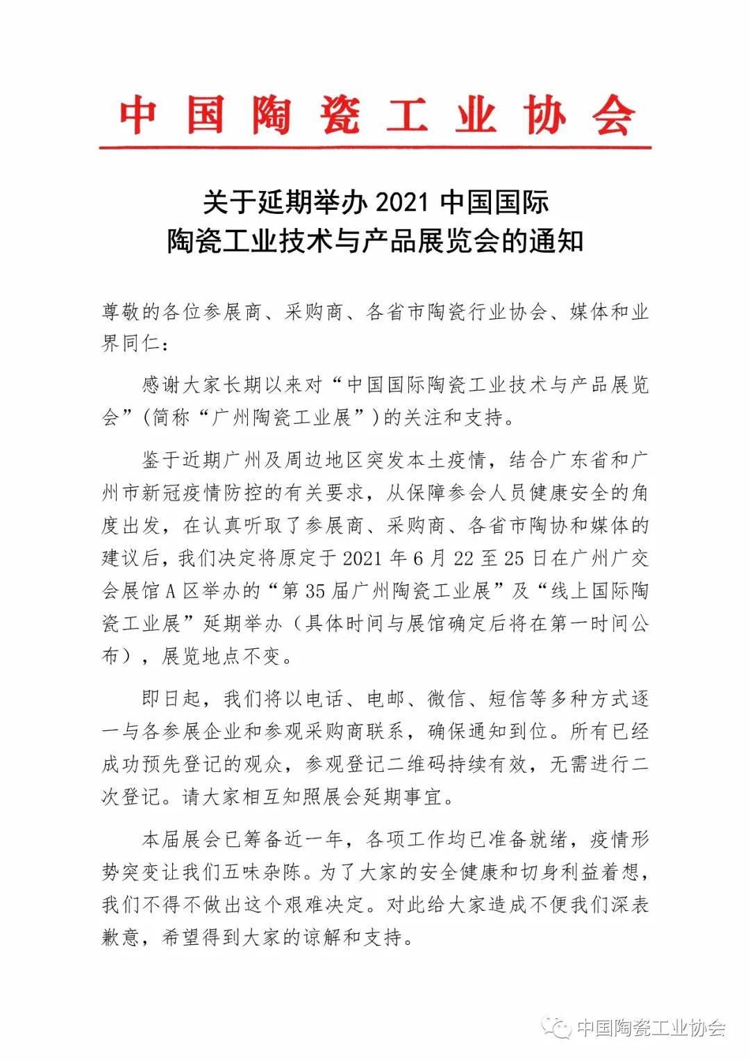 鉴于近期广州及周边地区突发本土疫情,结合广东省和广州市新冠疫情防控的有关要求,从保障参会人员健康安全的角度出发,在认真听取了参展商、采购商、各省市陶协和媒体的建议后,我们决定将原定于2021年6月22至25日在广州广交会展馆A区举办的“第35届广州陶瓷工业展”及“线上国际陶瓷工业展”延期举办(具体时间与展馆确定后将在第一时间公布),展览地点不变。