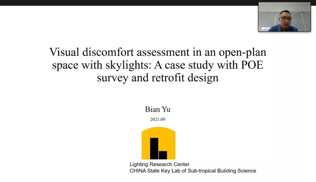 Seiko Kawashima副教授在《Short-term memory of color is modulated by arrayment of visual stimuli》报告中,探讨了颜色变化对视觉短时记忆的影响。通过对颜色刺激识别机制的研究,证实了颜色失配加速了视觉短时记忆中的识别,推测这些因素与颜色刺激和弹出刺激呈现时的视觉注意有关。未来会继续研究其他颜色刺激,阐明在包括形状等其他视觉刺激元素在内的颜色排列失配情况下对人类行为指标的影响。Seongsik Yoo博士带来的《A Study on the Location Selection of Luminance Measurement at the Access Zone of Tunnel》报告,通过实际测量分析了亮度计移动到可安装位置时,导致亮度测量结果的差异;并制作了混凝土表面样品,以计算根据隧道入口区混凝土路面上的太阳位置可能出现的亮度测量差异;基于此,对于实际隧道入口区域选择安装亮度计的位置给出建议。边宇副教授在《Visual discomfort assessment in an open-plan space with skylights》报告中,根据入住带天窗的开放式办公楼后评价(POE)调查(包括主观反馈收集和仪器测量)的结果,对特定场景下的视觉不舒适度进行评估,并提出了一种基于模拟的天窗和窗户改造方案。其研究结果涉及眩光等级和日光改造设计过程,可为带天窗的开放式空间引起的视觉不舒适问题提供解决方案。