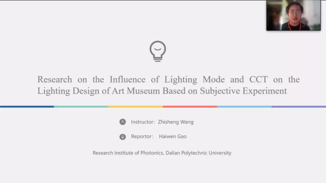Yusuke Tsuji博士在《Rotational behaviour of a non-focal system composed of two parabolic mirrors》报告中,研究了非聚焦聚光系统的旋转行为,建议采用由凹凸抛物面镜组成的新型结构将准直光转换成平行的凝聚光,并对模型进行了三个旋转:初始位置的镜面旋转、太阳跟踪的镜面旋转和整个系统的旋转,研究不同旋转方式对光通量的影响。徐俊丽副教授带来的《Effects of two light-dark patterns on sleep, alertness and mood in residential senior high school students》报告,介绍了在两个教室中进行的一项实地研究,实验期间以问卷方式评估被试者睡眠质量、警觉性、嗜睡、情绪、活力等相关指标,以探讨两种不同的明暗照明模式对寄宿高中生睡眠质量、警觉性和情绪的影响。冯凯博士在《A comparative analysis of subjective evaluation before and after experiment based on a lighting preference survey》报告中,基于对538份城市夜景调查问卷的分析,获得了不同性别人群的学习认知、照明偏好、影响因素(包括亮度、色彩动态等)、建筑水平、干扰光等多方面的初步判断,交叉分析评估不同人群对城市照明不同认知水平的照明偏好。对50人进行灯光训练实验,对比其训练前后的认知变化,提出夜景认知训练在城市夜景认知评价过程中的重要性和建议。Su-In Yun博士带来的《The control method of OLED lighting integrated blinds for development of PV-OLED blind systems》报告,研究了将OLED照明与百叶窗相连作为仿真工具的方法,并通过与实测值比较进行验证。此外,通过仿真工具推导出了百叶窗角度影响下的OLED室内照度分布,并提出了最佳角度范围和限制条件。